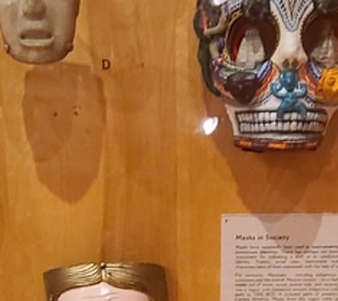 Left (or top on mobile): Alfonso Castillo Orta "Mask with pre Cuahtemoc figures" Right (bottom): Display of masks dating back to the 200 C.E through the early 1990s